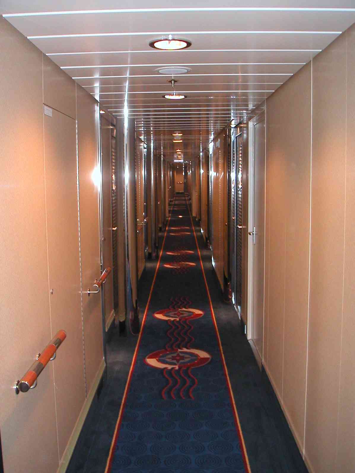 Noch einmal der Blick Richtung Fenster. In der Decke erkennt man Vorrichtungen, mit denen sich bei Bedarf weitere zwei Betten hervorzaubern lassen. Durch die geschickte in die Decke versteckte Anordnung hängen diese Betten tagsüber nicht in Form von Klappbetten von der Wand. Die Kabine erhält dadurch ein wesentlich gefälligeres Aussehen.