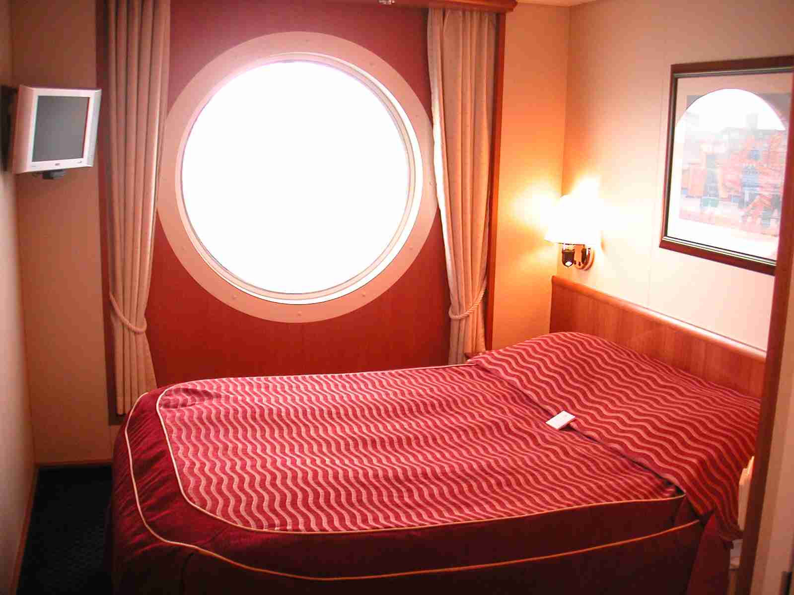 Blick von der Eingangtür Richtung Fenster. Die großen, runden Fenster sind charakteristisch für alle Kabinen auf dem Schiff und ermöglichen eine gute Sicht nach draußen (sofern nicht der Nebel einen Strich durch die Rechnung macht). Links kann ein Bett heruntergeklappt werden. Auch das Sofa rechts läßt sich in ein Bett verwandeln.