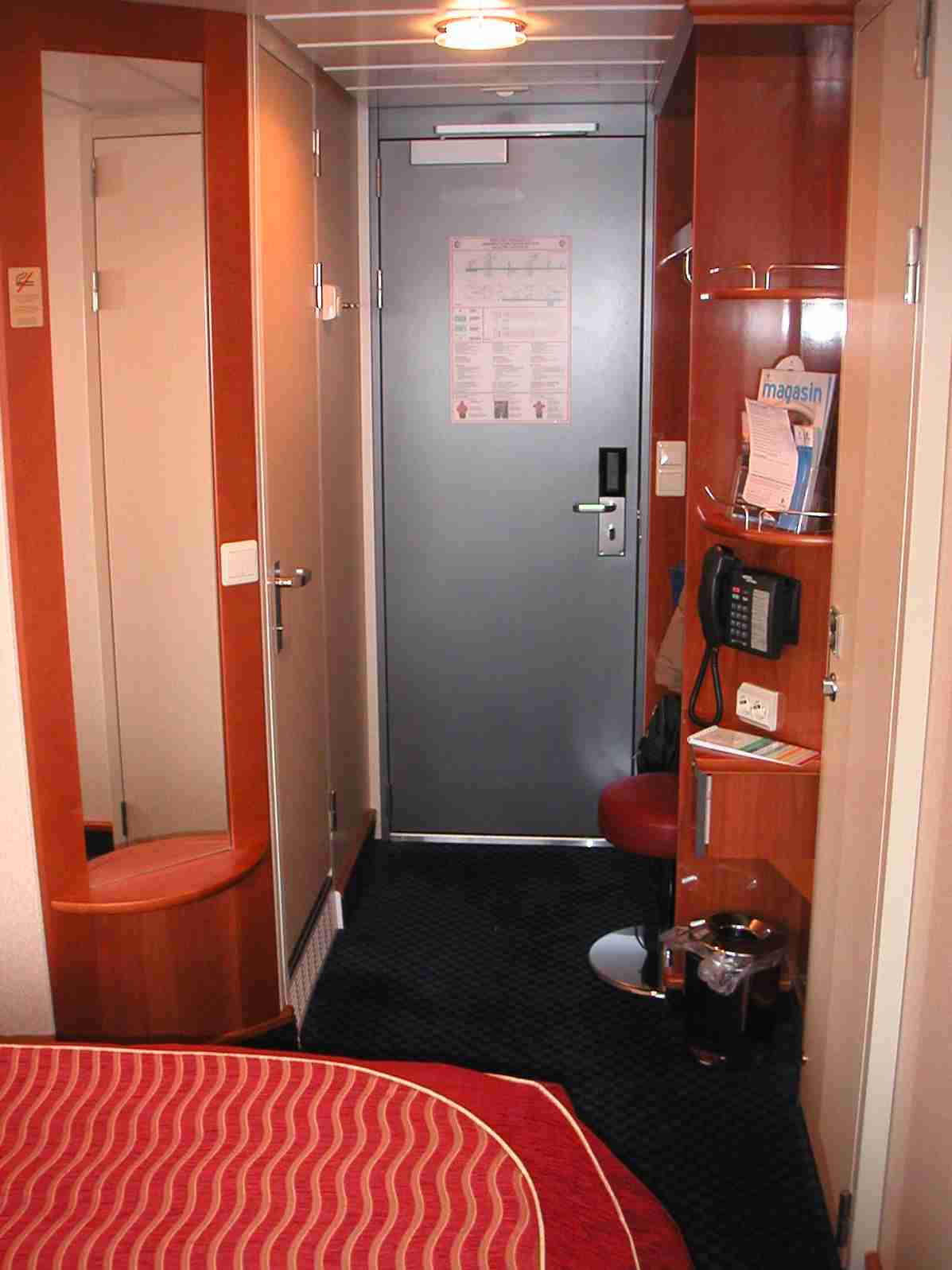 Blick Richtung Eingangstür in einer Kabine mit Doppelbett: Die Aufbau ist identisch zu dem in Kabinen mit Sofa und Klappbett, allerdings spiegelverkehrt.