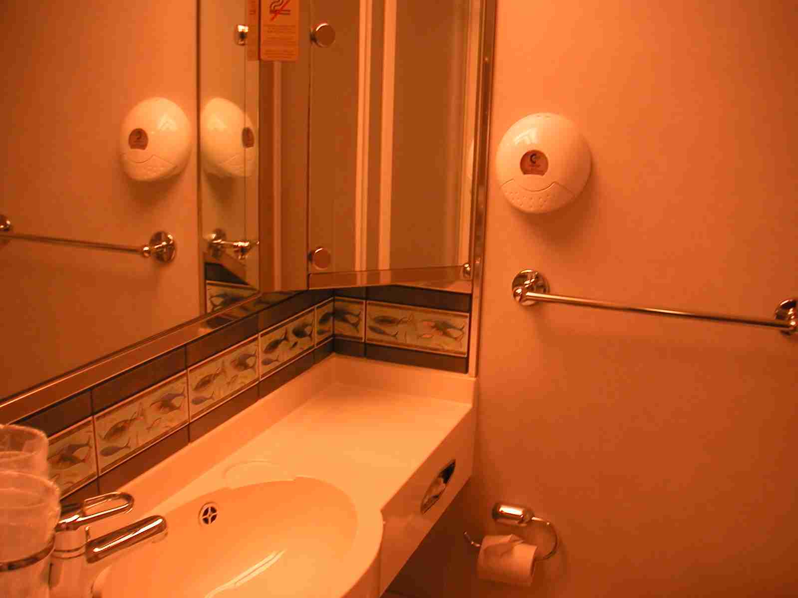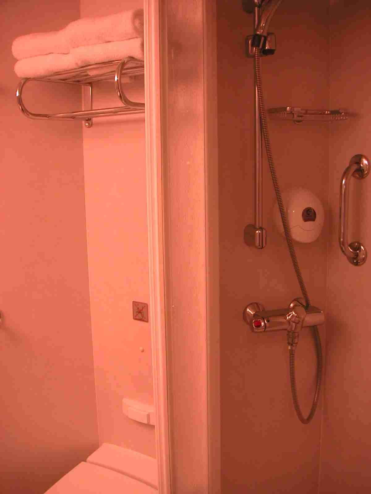 In der Bildmitte befindet sich die Eingangstür, links davon die Garderobe. Dies ist der einzige Stauraum für Kleidung. Weitere Ablagemöglichkeiten, wie z.B. Schränke, sucht man vergeblich. Gegenüber der Garderobe befindet sich der Eingang zum Bad / WC. Die Tür links ist eine Verbindung zur Nachbarkabine, die bei entsprechender Buchung geöffnet werden kann.