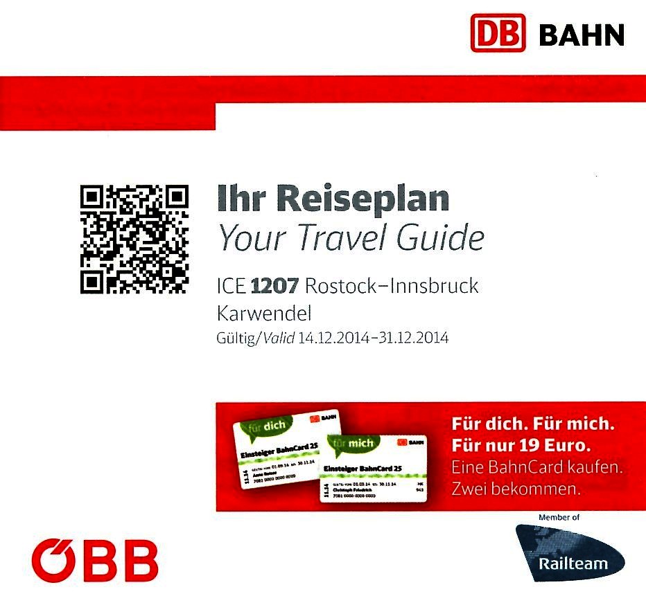 Auch der Zugname "Karwendel" (rechts) kann auf eine lange Historie zurückblicken, allerdings mit immer wieder wechselnden Zugläufen und Zuggattungen. Bereits im Ur-Netz des IC-Verkehrs aus dem Jahr 1971 fand man den "Karwendel" als IC noch mit BR 601 zwischen Frankfurt/M und Seefeld, später dann als IC und zum EC aufgewertet zwischen Hamburg und Innsbruck über Mittenwald, noch später dann wieder als IC zwischen Westfalen, dem Ruhrgebiet und dem Rheinland sowie Innsbruck. Die Bezugspunkte Innsbruck und die Karwendelbahn sind geblieben, aber im Jahrplanjahr 2014/15 führt es den Zug nun als ICE durch die neuen Bundesländer bis nach Rostock.