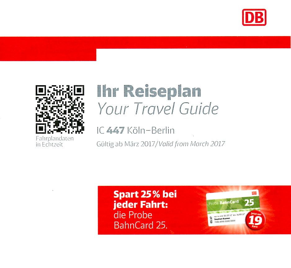 Bei dem ICE 1070 Frankfurt (M) - Berlin handelt es sich genau genommen gar nicht um einen ICE, sondern um einen lokbespannten Zug, der mit einer ehemaligen Metropolitan-Garnitur unterwegs ist. Dies verrät auch die Wagenreihung auf der zweiten Seite des Reiseplans (unten).