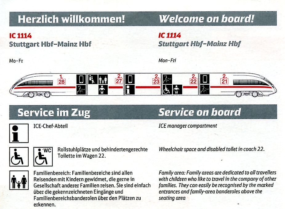 Bei Reiseplänen von ICE-Zügen wird die Wagenreihung in der Regel auf der ersten Umschlagseite abgebildet.