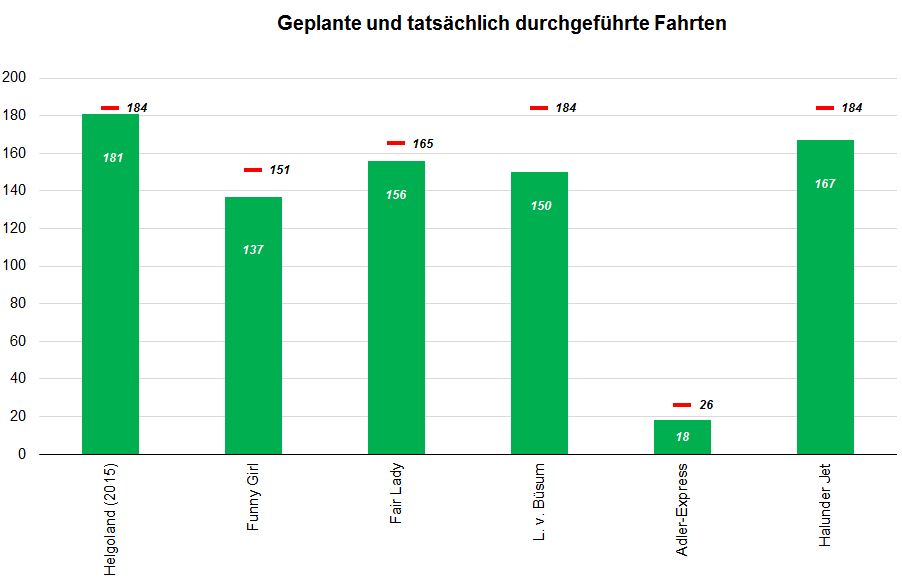 Die nebenstehende Graphik zeigt die geplanten und tatsächlich durchgeführten Fahrten pro Helgoland-Schiff an. Insgesamt sollten 894 Fahrten erfolgen, 809 konnten dann schließlich absolviert werden. Der "Adler-Express" lief die Insel nur montags an und kommt so auf eine vergleichsweise geringe Anzahl an Fahrten. Widersprüchlich erscheint zunächst die maximale Anzahl der "Fair Lady"-Fahrten (165) gegenüber jener der "Funny Girl"-Fahrten (151), da die Bremerhaven-Saison viel kürzer war als die Büsum-Saison. Dies erklärt sich jedoch dadurch, daß die "Fair Lady" die "Funny Girl" auf der Büsum-Route bis zum 17. Mai ersetzte.