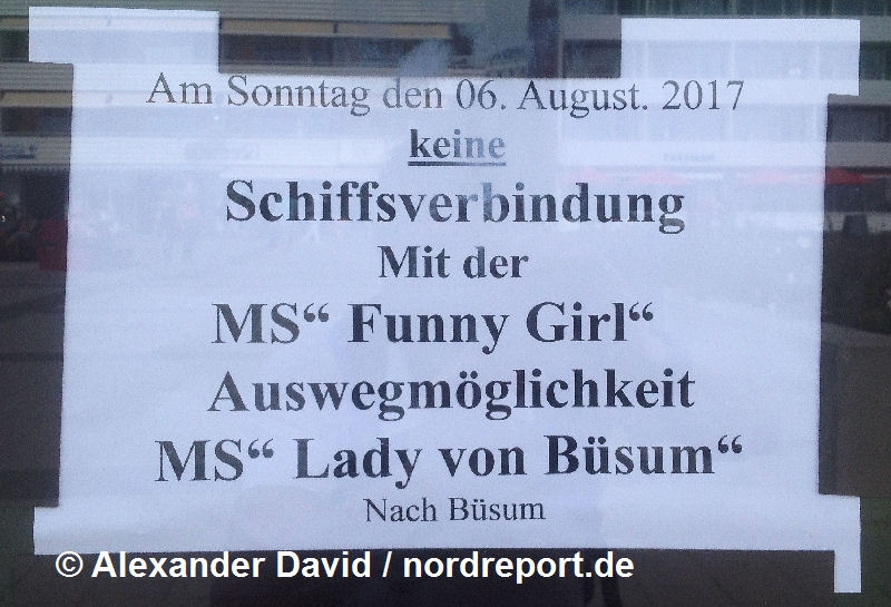 An Samstagen weicht die Abfahrtszeit der "Funny Girl" aufgrund des längeren Inselaufenthaltes unverändert zu 2016 von den anderen Wochentagen ab (letztes Boot erst 17:20 Uhr). Das obige Foto vom 5. August 2017 zeigt dieses Szenario.