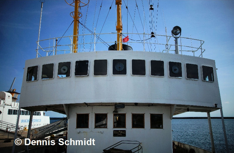 Das Werftschild, das mittig unter der Brücke angebracht ist, verrät, daß das Schiff 1938 bei den Oderwerken in Stettin gebaut wurde.