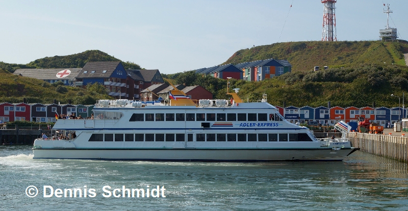 Im Vergleich zu den arrivierten Vertretern der Helgoland-Flotte ist der "Adler-Express", der normalerweise im Wattenmeer Nordfrieslands zu Hause ist, immer noch ein kleiner Exot. Immer nur montags kann man ihn vor der Helgoländer Kulisse ablichten, wenn das Wetter es denn zuläßt. Und wenn sich dann die Gelegenheit ergibt, bringt der Shipspotter natürlich seine Kamera in Position: