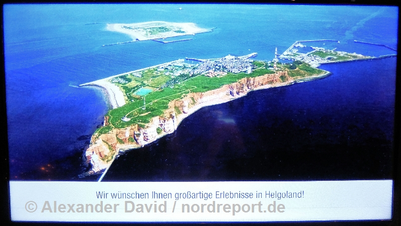 rechts ein Erinnerungsstück an Bord an einen Helgoland-Besuch des Schiffes im Jahr 2009.