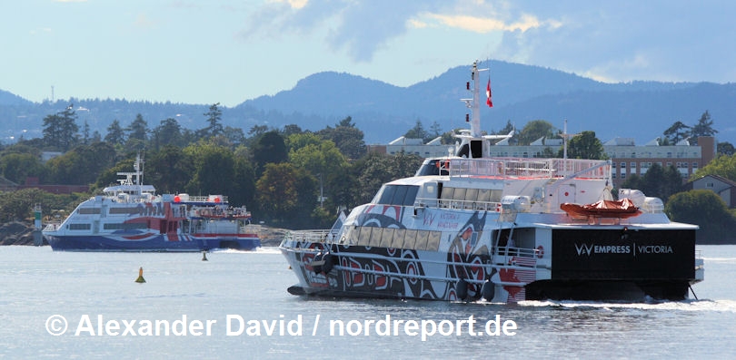 Auf der Route zwischen Vancouver und Victoria wäre der "Halunder Jet" (I) übrigens auf einen Wettbewerber getroffen. Die Reederei V2V setzt seit dem letzten Jahr auf dieser Verbindung den Katamaran "V2V Empress" ein, der bereits auf einem Foto weiter oben in der Hafenausfahrt von Victoria zusammen mit "Victoria Clipper V" zu sehen ist.