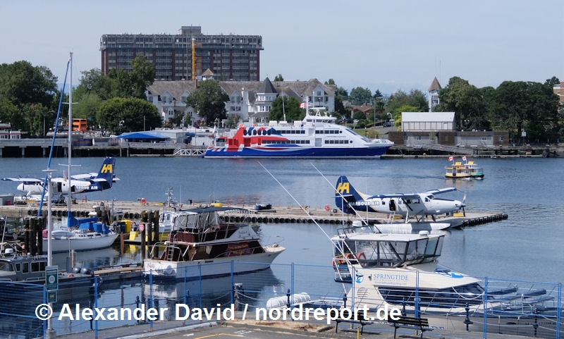 Neben dem ohnehin schon umfangreichen Schiffsverkehr wird die schmale Ein- und Ausfahrt zum und vom Inner Harbour von Victoria auch noch intensiv von Wasserflugzeugen genutzt. Je nach Windrichtung starten und landen die Flugzeuge sogar gegen die Fahrtrichtung der Schiffe! Im obigen Foto folgt dem "Halunder Jet" (I) eine Twin Otter der Harbour Air, die zum Start nach Vancouver ansetzt.