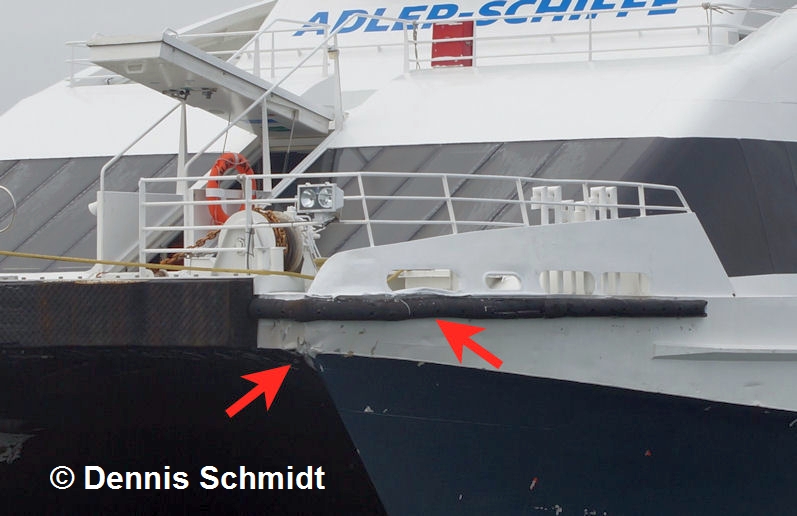 Die Folien auf der Außenhaut, die den "Halunder Jet" in das British-Columbia-Outfit verwandelt haben, hat der Katamaran schon in Hamburg vor der Überführung nach Amerika bekommen. Direkt über der Wasserlinie ist die Folie an der Backbordseite in der hinteren Hälfte des Schiffes inzwischen leicht lädiert, sodaß die grüne Farbgebung aus der Helgoland-Zeit wieder zum Vorschein kommt.