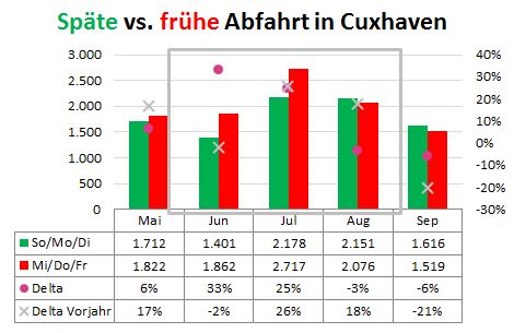 In diesem Jahr fuhr die "Helgoland" im Zeitraum 1. Juni bis 31. August mittwochs, donnerstags und freitags bereits um 9:30 Uhr in Cuxhaven ab und ermöglichte den Tagesbesuchern an diesen Wochentagen einen langen Inselaufenthalt von etwa fünf Stunden. An Sonntagen, Montagen und Dienstagen wurde nach dem alten Schema erst um 10:15 Uhr in Cuxhaven abgefahren. Es stellt sich nun natürlich die Frage, ob man über die durchschnittlichen Besucherwerte der Wochentage auf die Resonanz der früheren Abfahrten mit langem Inselaufenthalt schließen kann. Dafür wurden die Vergleichstage Sonntag bis Dienstag und Mittwoch bis Freitag gegeneinander gestellt. Der Samstag als stärkster Tag der Saison geht nicht in den Vergleich ein. Im Mai und September gab es ausschließlich späte Abfahrten ab Cuxhaven (10:15 Uhr), sodaß diese Monate als Vergleichsparameter zur Interpretation der Veränderungsraten dienen. Es wurden nur die Tage erfaßt, an diesen die "Fair Lady" tatsächlich ab Bremerhaven fuhr. Um eine vergleichbare Datenbasis zu gewährleisten, wurden Hooksiel-Termine nicht verwertet, da die Besucherzahlen hier zumeist deutlich höher liegen. Feiertage und statistische Ausreißer durch Schiffsausfälle wurden ebenfalls ausgeschlossen. Auf Basis der dabei noch verbleibenden Tage wurden die durchschnittlichen Tagesgäste in beiden Gruppen Sonntag bis Dienstag und Mittwoch bis Freitag ermittelt und die Veränderungsrate zwischen den Gruppen berechnet.