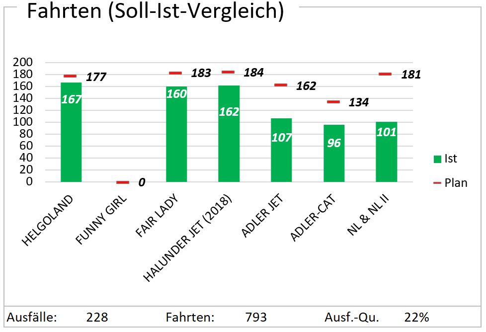 Da die "Nordlicht" aufgrund technischer Schwierigkeiten Ende Juni / Anfang Juli nicht eingesetzt werden konnte und dann im weiteren Verlauf wegen längerer Vertretung der "Nordlicht II" im Borkum-Verkehr aus dem Helgoland-Fahrplan genommen werden mußte, liegt die Anzahl der geplanten Fahrten bei dieser Betrachtung bei der "Nordlicht" bei 181.