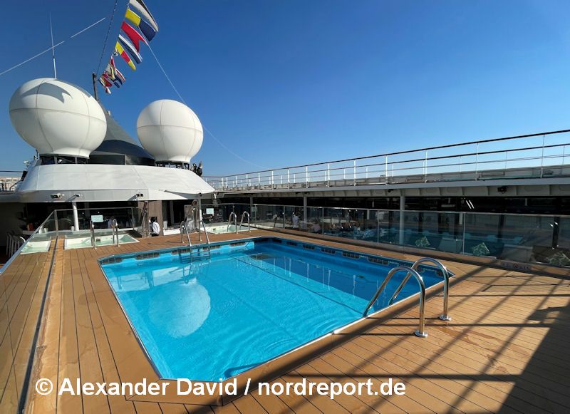 Beste Aussicht nach vorne garantiert der Bereich direkt über der Brücke vor der Observation Lounge (oben). Nicht minder attraktiv ist es zwei Decks tiefer, wo man auf dem Vorschiff bis zum Bug gelangen kann (unten).